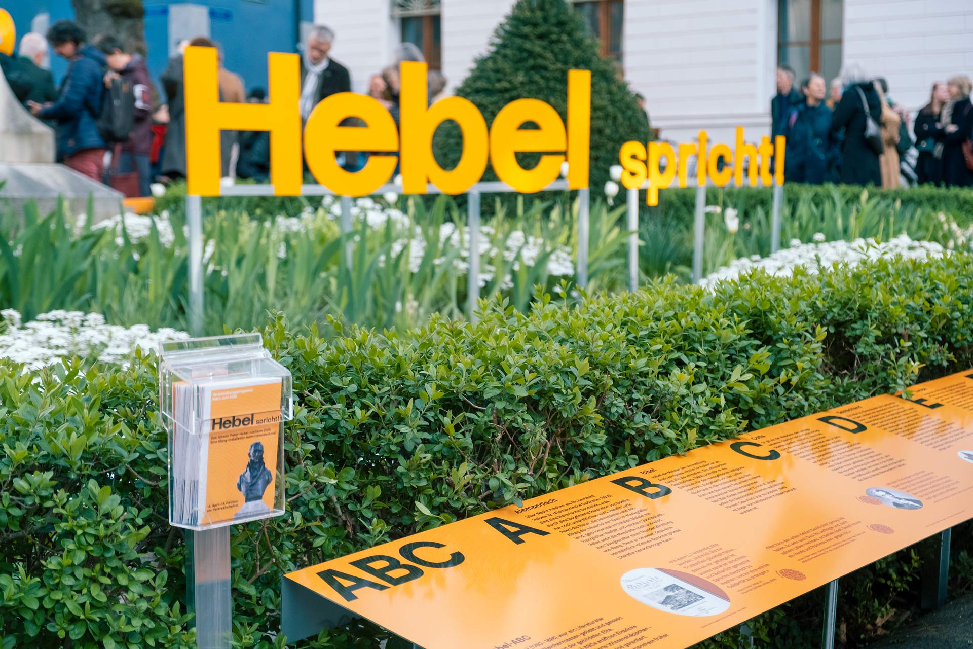 Es ergänzt die Klanginstallation und bringt Hebel in 26 Buchstaben auf den Punkt. Von A bis Z, von Europa, Klima und Landwirtschaft über Neutralität und Traum bis zu Vergänglichkeit zeigt das Alphabet, wie aktuell Hebel ist. Die Texttafeln rund um das Denkmal spielen mit vergessenen Wörtern und heutigen Begriffen und setzen beide in einen Dialog mit Hebels Lebens- und Gedankenwelt. Wer liest, merkt schnell: Hebel war in manchem früher dran als wir.